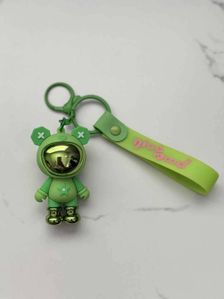 This cute astronaut bear keychain with wristle features a small bear dressed in a space suit, combining charm and adventure. It comes with a matching wristlet strap for easy carrying and is offered in four colors, adding variety to suit different styles.