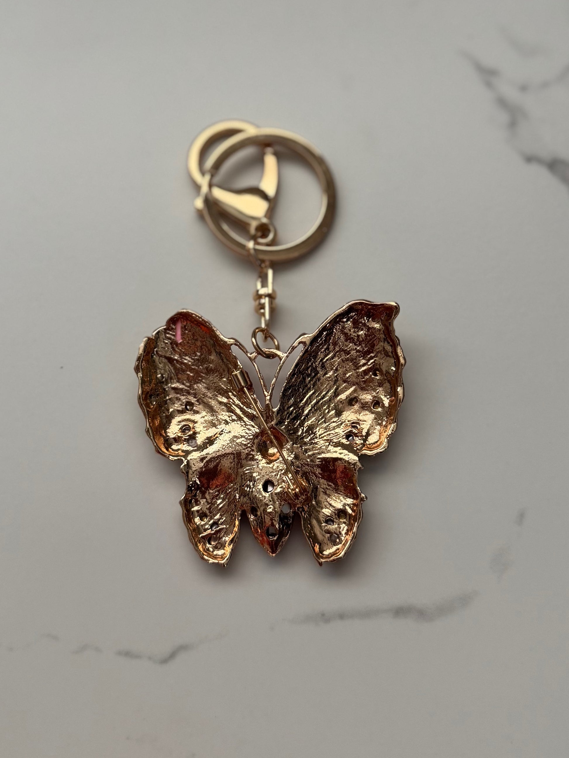 This elegant butterfly keychain features a delicate, metallic design with intricate wing details, adding a touch of charm and sophistication to your everyday carry. Versatile and stylish, it doubles as a decorative pin—perfect for accessorizing bags, jackets, or hats with effortless grace.