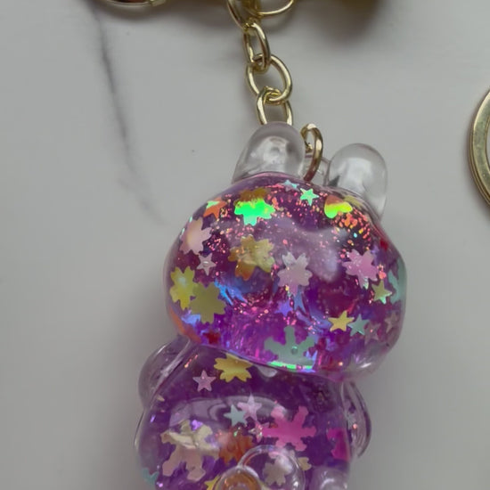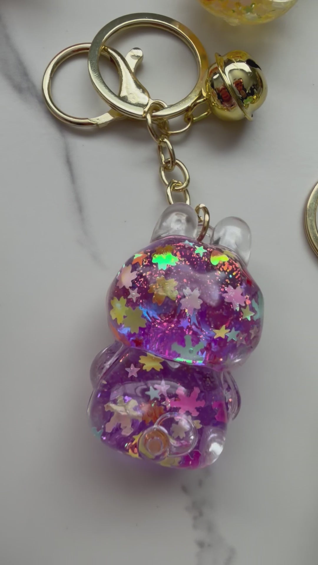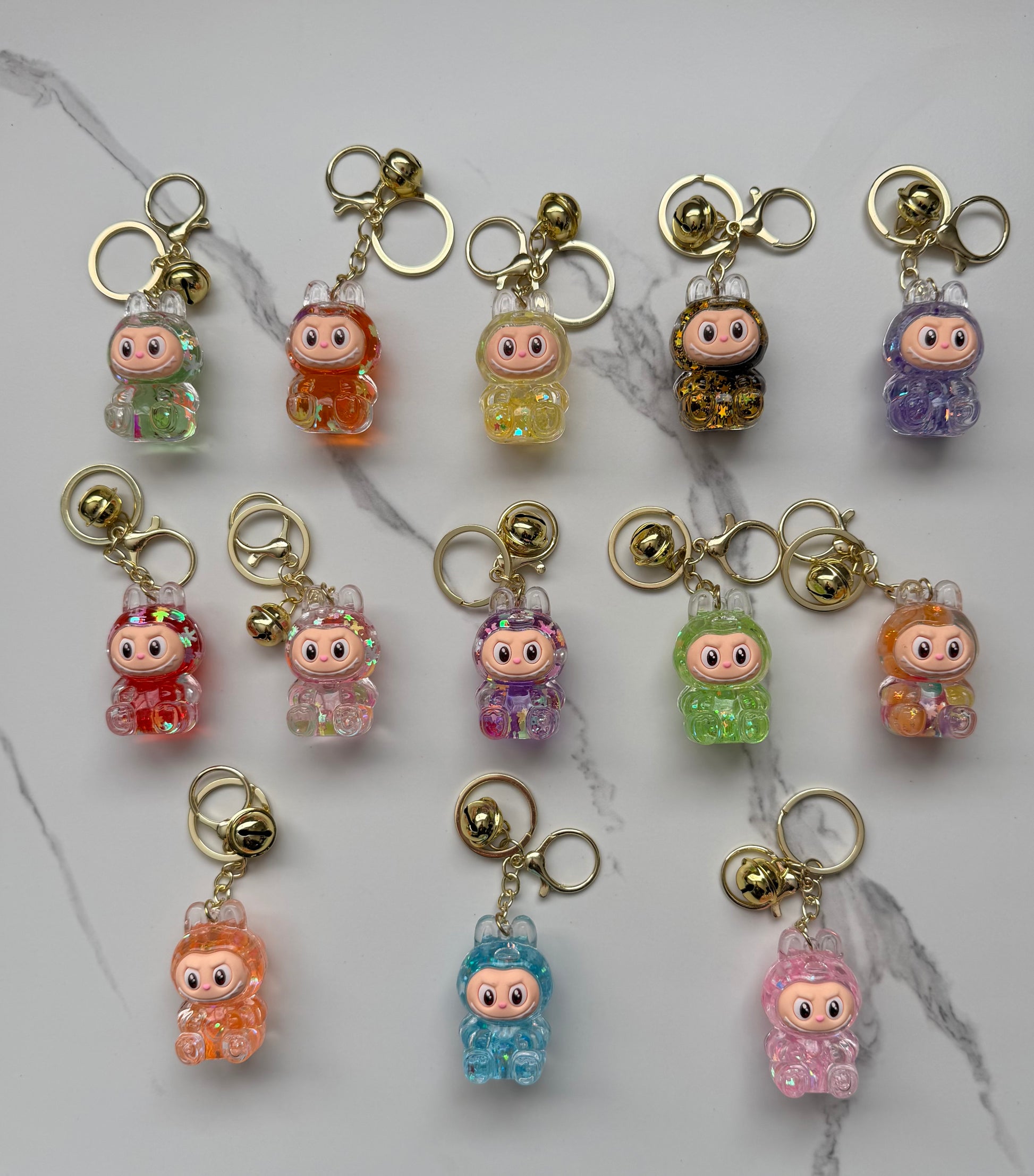 These 2 inch colorful collectible keychains are featuring cute little labubu figures made of translucent resin. Each one is filled with glitter and liquid, giving them a sparkly, floating effect when moved. They come in a wide variety of colors which you will receive at random!